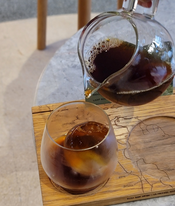 저는 추천 표시가 있는 NINE ONE 원두를 드립 방식으로 주문했습니다. 예쁜 원형 얼음과 함께 제공되는데, 일반적인 커피 향보다는 독특한 '차(Tea)' 같은 향이 매력적이었습니다. 평소 접해보지 못한 이국적인 커피 맛이라 여행지에서의 특별한 경험으로 좋았습니다.