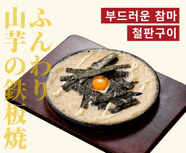 • 일본어로는 '푹신한 산약이 철판구이'로, 마(山芋)를 갈아서 계란 노른자·김과 함께 익힌 인기 사이드 메뉴입니다.