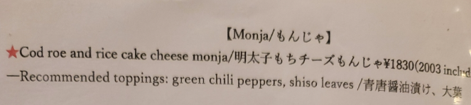 - 인기 메뉴 : 명란 몬자야키 (세금 포함 2,003엔)