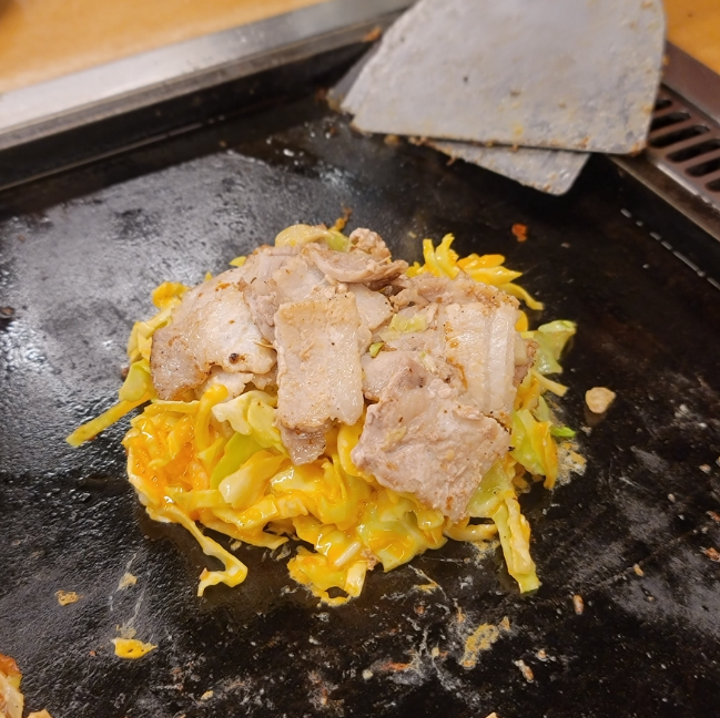 - '돼지고기 오코노미야키(1,078엔)'를 주문했고, 이 역시 직원분이 직접 만들어주셨습니다.