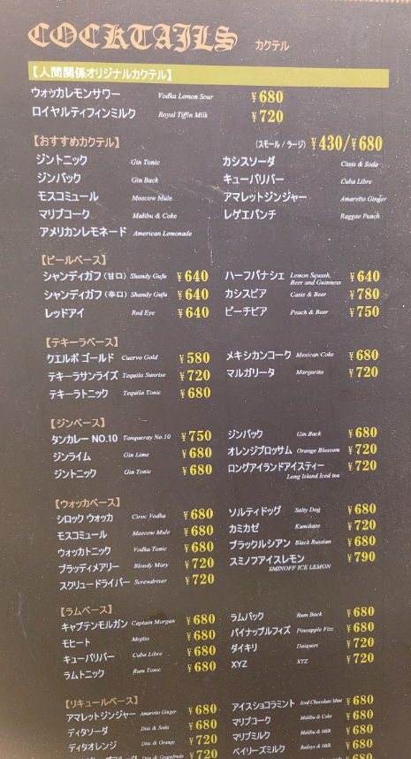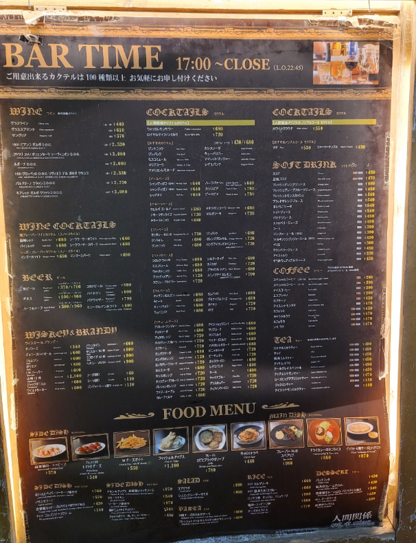 - 주류 : 글라스 와인(610엔), 맥주, 위스키, 칵테일 등