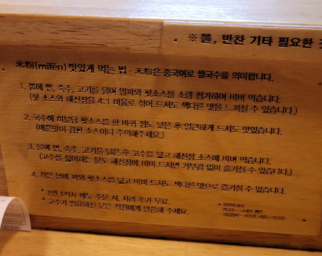 자리에 앉으면 미분당 쌀국수를 더 맛있게 먹는 방법이 적혀 있습니다.